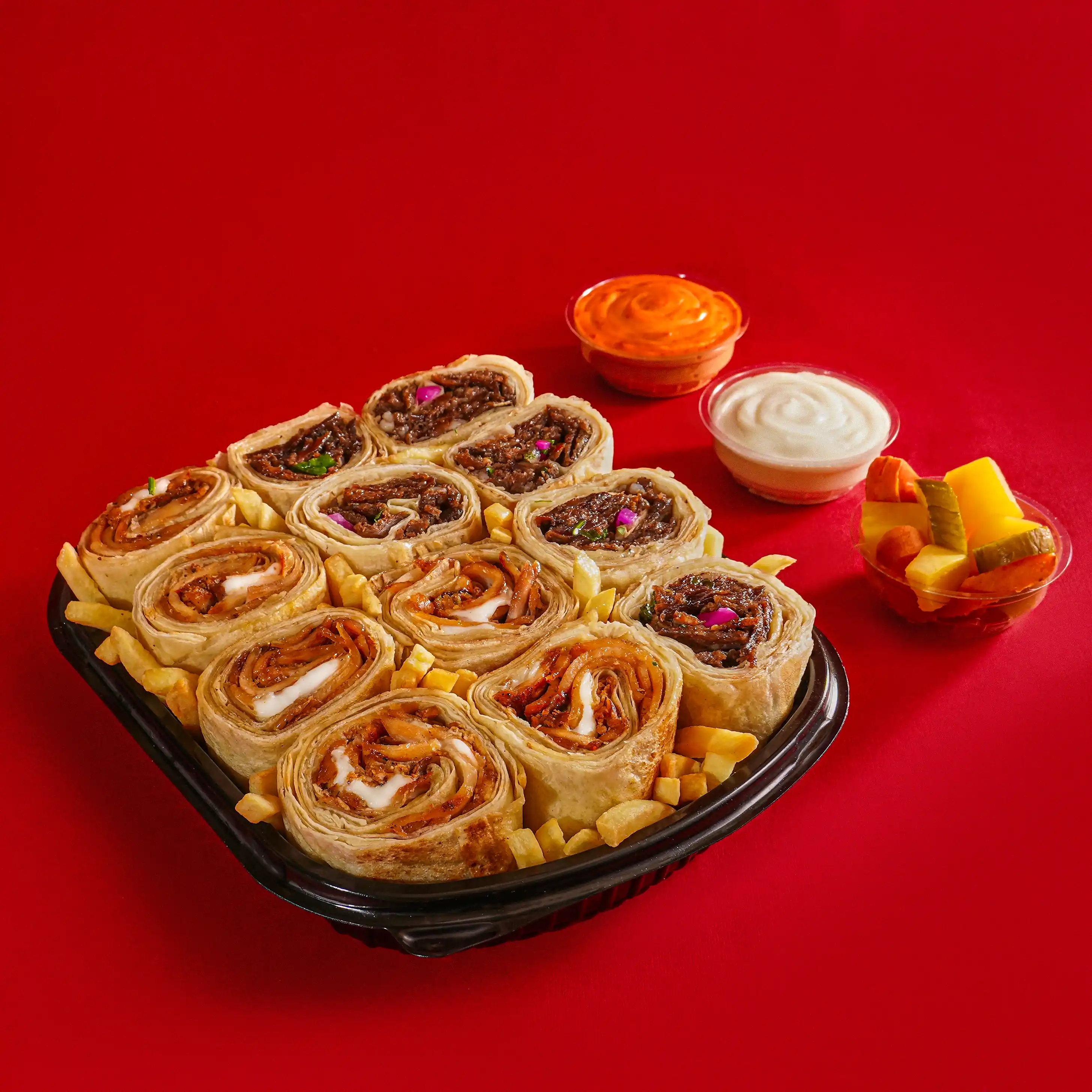 3 قطع شاورما فراخ عربي + 6 قطع شاورما لحمة عربي + 3 قطع كرسبي + بطاطس + 2 كبيبة + 2 سمبوسة + عيش محمص + ثومية + ثومية سبايسي + مخلل